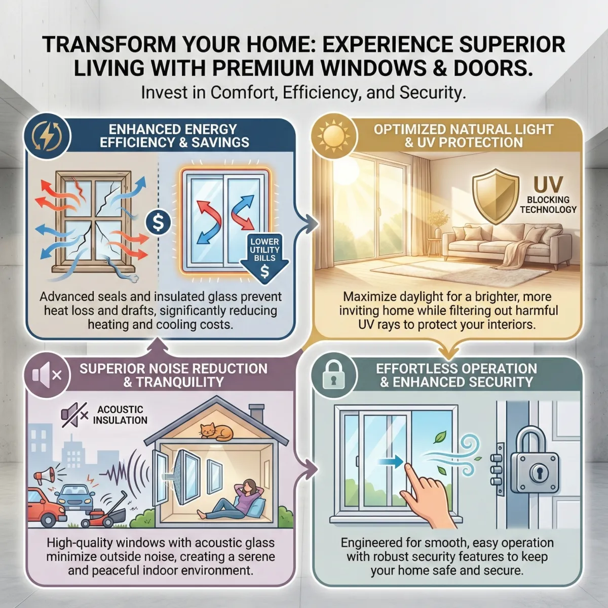 Easy and Safe: You should be able to open a window with just one finger. New windows and doors slide smoothly and lock tight. This keeps your home safe and makes it easy to let in a fresh breeze whenever you want.